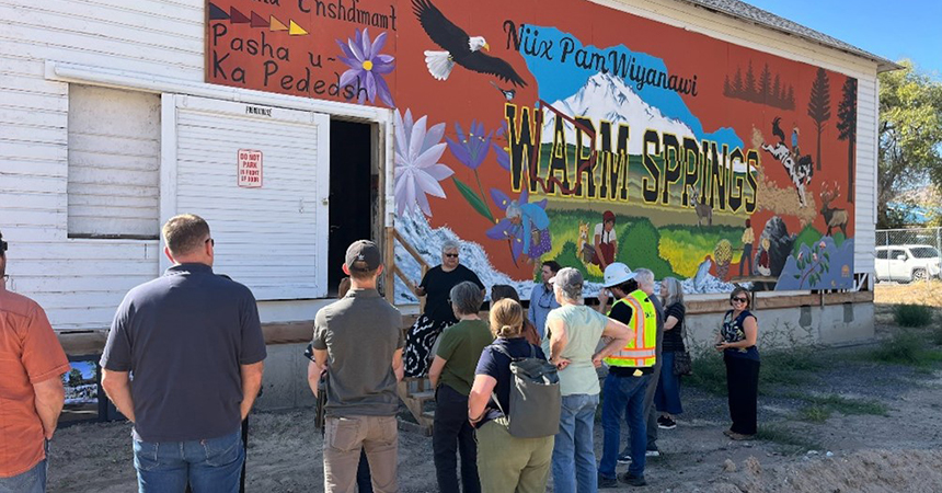 The board began their visit at the Confederated Tribes of Warm Springs reservation, where they toured Sherer Street, an entire cul-de-sac of single-family and duplex properties upgraded with energy efficiency features. Through Energy Trust’s ongoing partnership with Warm Springs Housing Authority, the homes with energy-efficient upgrades are already helping reduce utility costs for residents – all of whom have incomes 80% or lower than Oregon’s median – while keeping them more comfortable and safer during the increasingly hot summers and cold winters in Warm Springs.